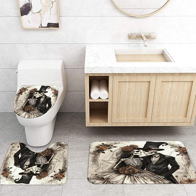 NEWSUYAA Halloween Decorations Shower Curtain Set with Non-Slip Rugs and Bath Mats,Black Skull Skeleton Bathtub Curtains with 12 Hooks,All Saints'Day (Nov 1st) Bathroom Decor