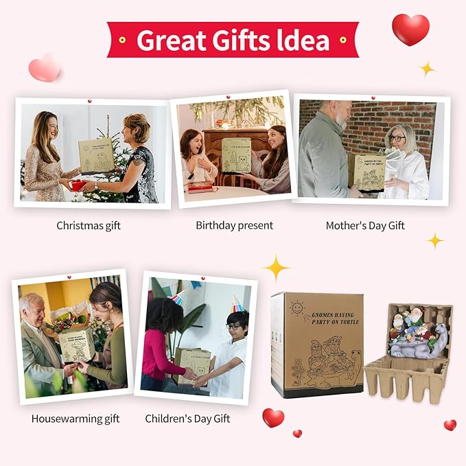 - Unique design: The vivid details of this solar garden statue depict these scenes of happy life,Three gnomes are having a party on a turtle, one playing guitar, one drinking, and one sleeping. The turtle slowly brought them home. making it a beautiful and lovely solar garden statue. Dimensions of 11.81X9.05X8.66 inches.