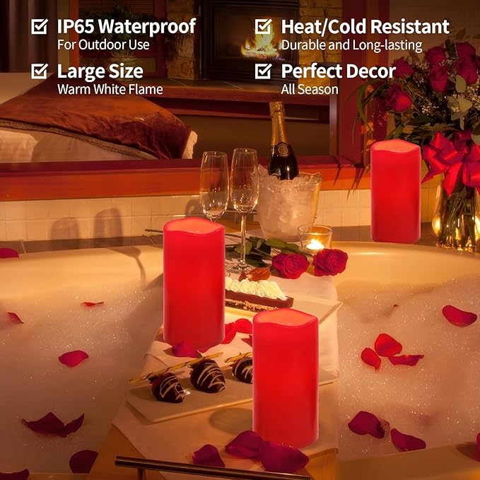 - EXTRA LARGE PILLAR CANDLE: Measures 8 inch in height, 4 inch in diameter, bigger than most waterproof candles, tea lights and votive candles. When you light up this led candles ,They look like real candles with flame, Flameless and smoke-free,real and full of beauty.Elevate your outdoor ambiance with our extra-large flameless candle in patio, porch, verandas, pools, and courtyards
