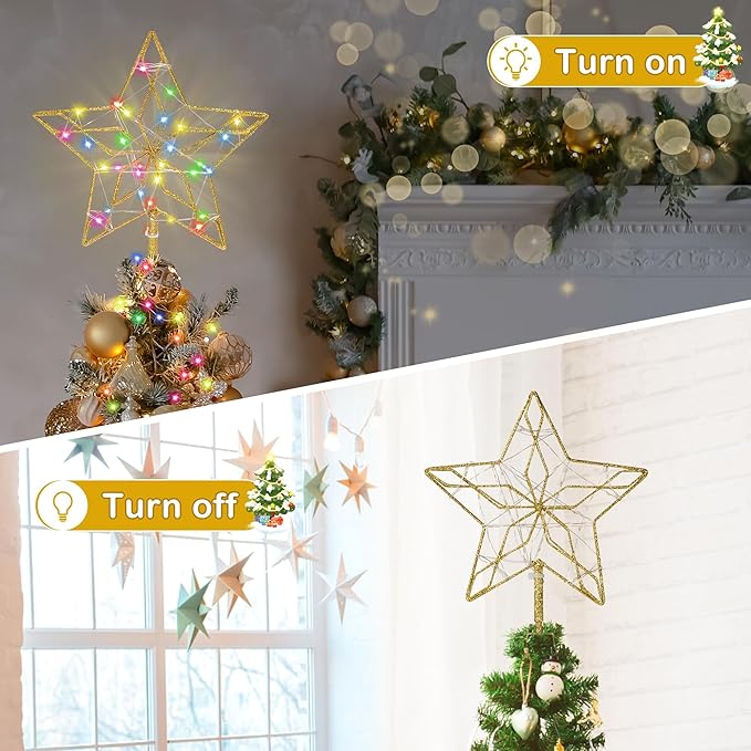 - Stable Sturdy Christmas Tree Topper:The Christmas tree topper is made from lightweight Metal with glittery coating.Christmas star topper's designed to simply sit on top of a branch tip.Gold glittered star tree topper adds a beautiful and elegant finish to Christmas tree.3 D hollow design gives Christmas Tree Topper a delicate and the glitter adds just the right amount of sparkle.A lovely,classic addition that brings a touch of magic to holiday decor