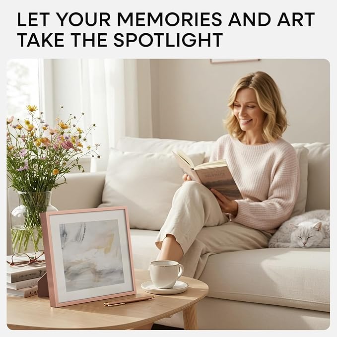 Homeforia 10x10 Picture Frame Rose Gold, High End Metal 10 by 10 Square Frames with Mat 8 x 8 Photo, 10by10 Poster Frame Matted to 8x8 Print, Wall or Tabletop Frame, Tempered Glass, Wall Kit, Set of 1