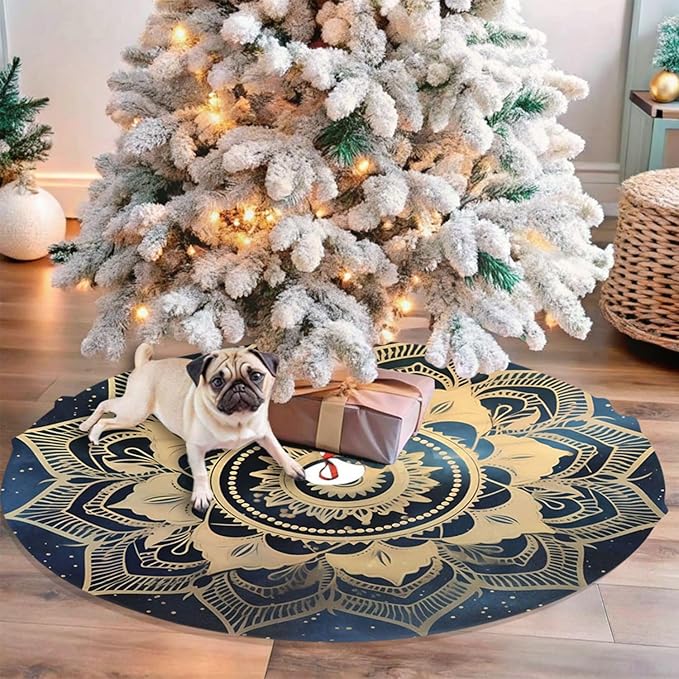36" Elegant Gold Mandala Christmas Tree Skirt, Blue Galaxy Tree Mat Base Cover for Xmas Festive Holiday Party Decoration Ornaments