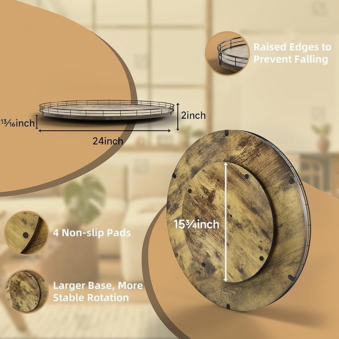 - Thoughtful Design - The raised edges are made of iron, which is sturdy and prevents items from falling off the turntable. The base is large enough and equipped with 3 anti-slip pads, the rotation is smoother and prevents scratches. No installation required, easy to use