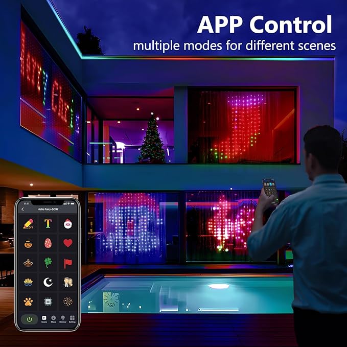 - โจใMULTIPLE SCENES & DIY MODESใ: Our remote offers access to 144 captivating holiday-themed patterns, including Christmas, Halloween, Easter, and more. You can adjust music sensitivity, light position, and speed directly from the remote. But via app, you can take it further by uploading your own photos or drawing custom designs. Create unique lighting effects by sketching a heart, writing โLOVE U,โ or uploading any image to sync with your curtain lights, adding a personal touch to any scene.
