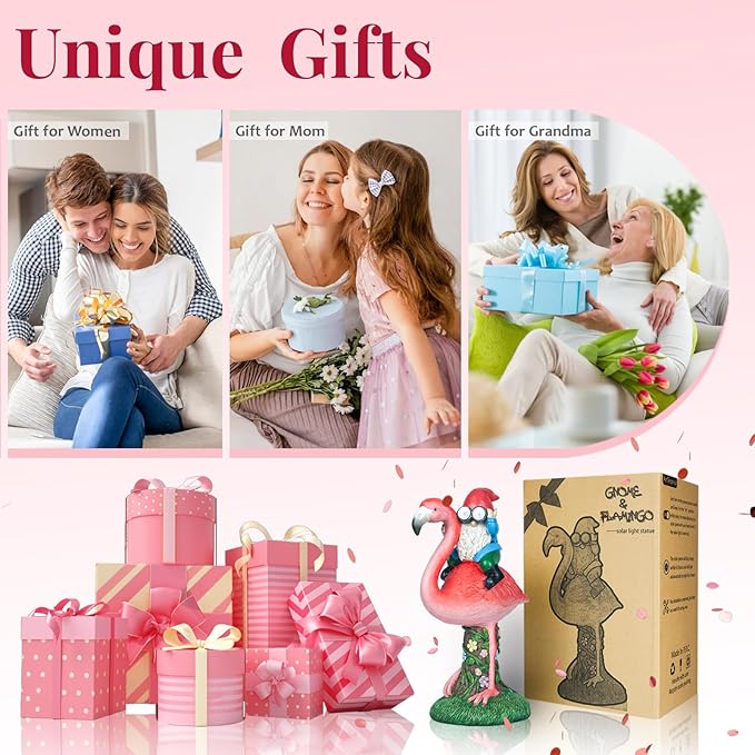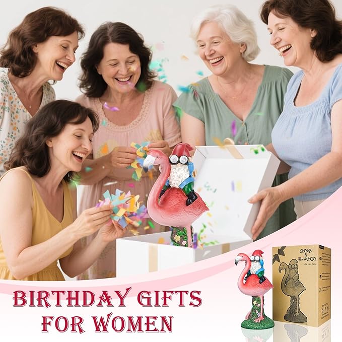 Solar Flamingo Gnome Garden Decor Statue, Outdoor Funny Solar Light Decoration for Yard, Patio, Lawn, Unique Housewarming, Birthday Gift for Women, Mom, Grandma