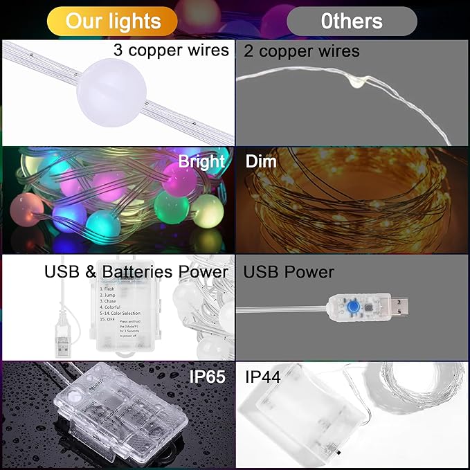 - 【IP65 Waterproof & Hassle-Free Install】Experience the ultimate in outdoor illumination with string lights that triumph over any climate—rain, snow, or shine. These marvels of simplicity require zero wiring, making installation a snap. Effortlessly adorn your walls, windows, doors, floors, ceilings, lawns, Christmas trees, or even buildings, and infuse your home and garden with an enchanting atmosphere that's both cozy and captivating.