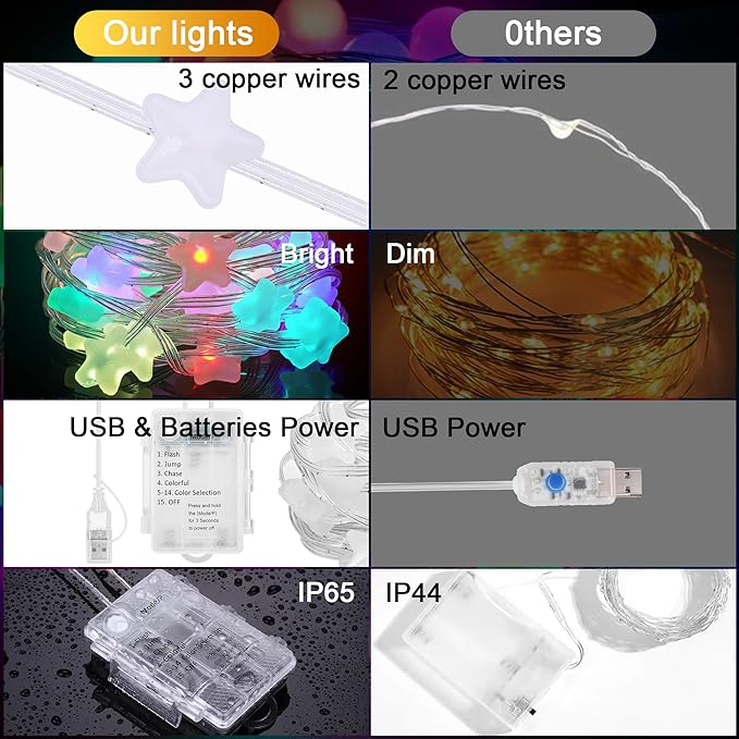 - 【String Lights with Remote】The mini Christmas lights have 2 ways to change the color and mode, remote or bottom in battery box. Hanging lights in bedroom, room, curtain, classroom, patio, garden tree, fairy lights with remote easy to changing ON/OFF, brightness, timer.