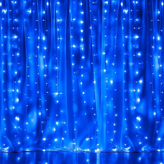 - Enchanting Blue Glow: Transform your space with a warm, inviting glow using these 300 LED curtain string lights. Measuring 9.8ft in width and 9.8ft in length, include a 9.8ft leading wire for flexible use.