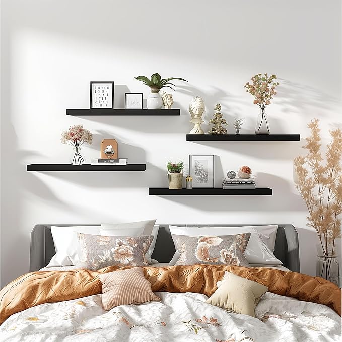 Wood Floating Shelves for Wall Decor, Rustic Wall Shelves for Bedroom Bathroom Kitchen Living Room, Set of 4 Black 24 Inch