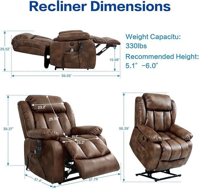 - 【Heating and Massage】The lift chair has eight massage points; three massage modes, the waist has a heating system that can provide waist care and heating for the elderly or other people in need; at the same time, the temperature-controlled heating system, 113℉~140℉, when it reaches 140℉, it will automatically cut off the power and continue to cool down to 113℉ before heating.