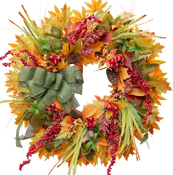 - 【Vibrant & Lifelike Fall Door Wreath】This 24 inch autumn wreaths for front door is filled with lifelike autumn leaves in warm tones, red berries, pine cones, and a charming green bow. It adds a stunning seasonal touch to your front door decor