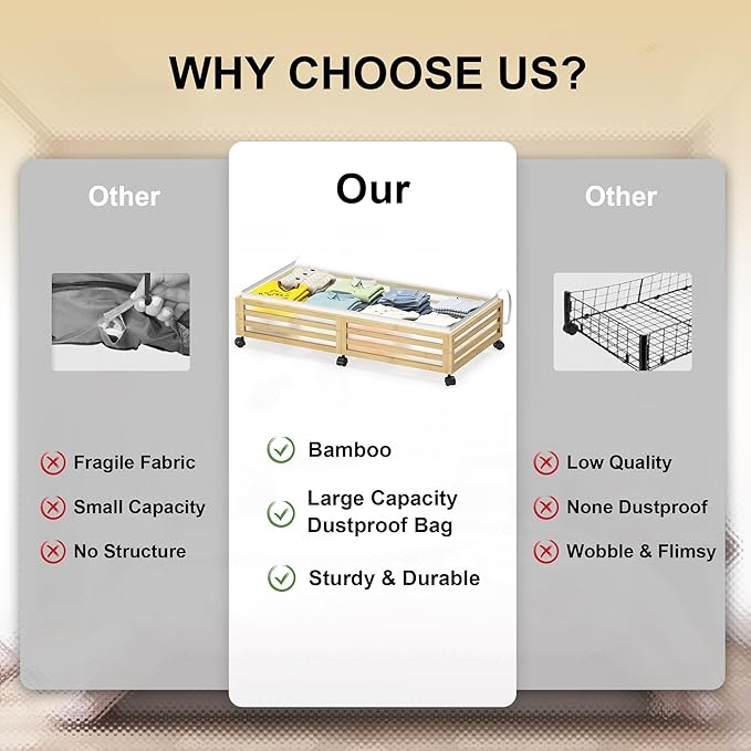 - ✅【Sturdy Under Bed Storage】:Our underbed storage units are built to last with high-quality 100% Real Bamboo,Beautiful appearance compared,oasting 4 rotating wheels with capacity of 120lbs, 48L large capacity dustproof cover bags hile the load-bearing capacity and durability are dramatically increased ,It's a versatile storage solution that can be customized based on your needs.