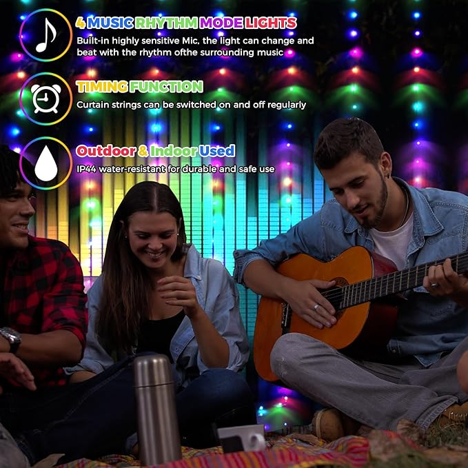 - App Functions: You can choose hundreds of colors through app. And allows the timer function to accurate to the second. App also allow your playlists to sync with the DIY curtain string lights, the light can change and beat with the rhythm of the surrounding music