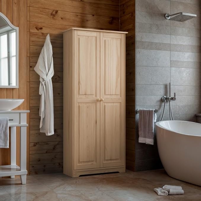 - SOLID WOOD KITCHEN AND LAUNDRY PANTRY CABINET WITH 2 DOORS - constructed from solid wood for a durable, long-lasting design and features 3 adjustable + 1 fixed shelves providing room for all your supplies. Unfinished for versitility