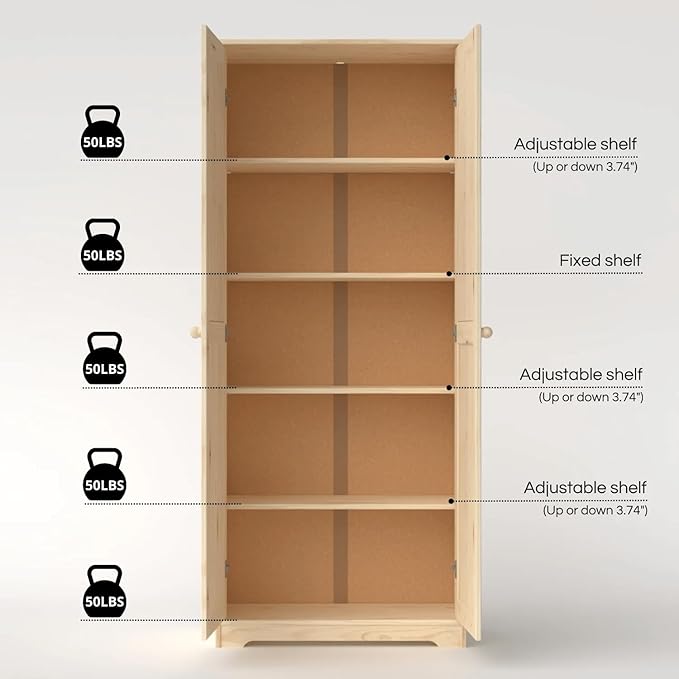 - ADJUSTABLE SHELVES FOR FLEXIBLE STORAGE – This solid wood storage cabinet features adjustable shelves, perfect for organizing kitchen items, pantry supplies, linens, or tools, giving you the flexibility to store various items in one convenient place.