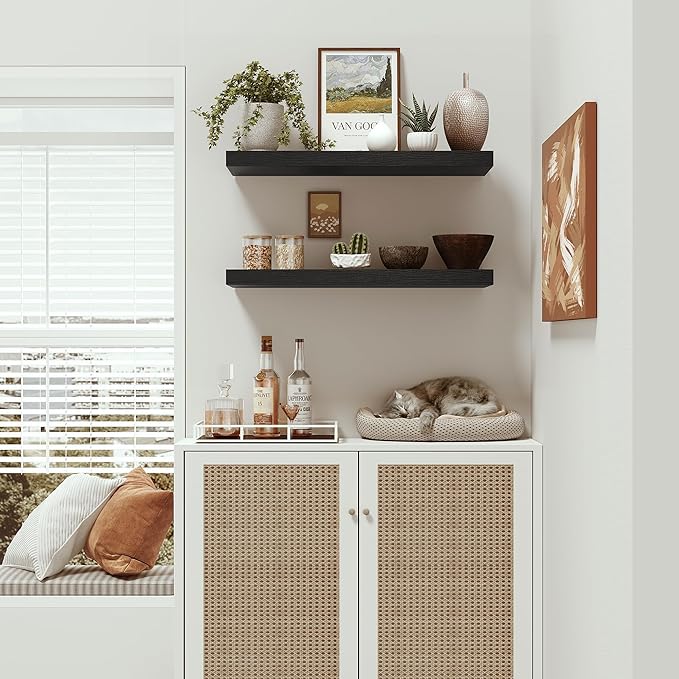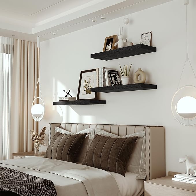 - Well-designed Floating Shelves - The rustic style floating shelves combining both practicality and style. These shelves offer a generous deeper and thicker surface, perfect for organizing daily sundries without taking up valuable floor space. The various of selected colours finish adds a cozy, natural element,display your art pieces on the wall to decorate your home, and make it full of aesthetic flare.