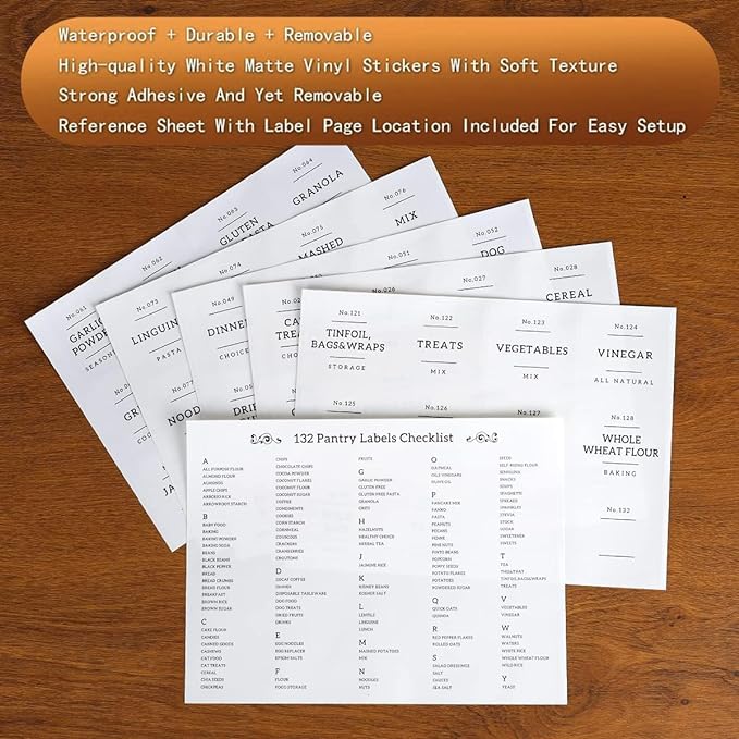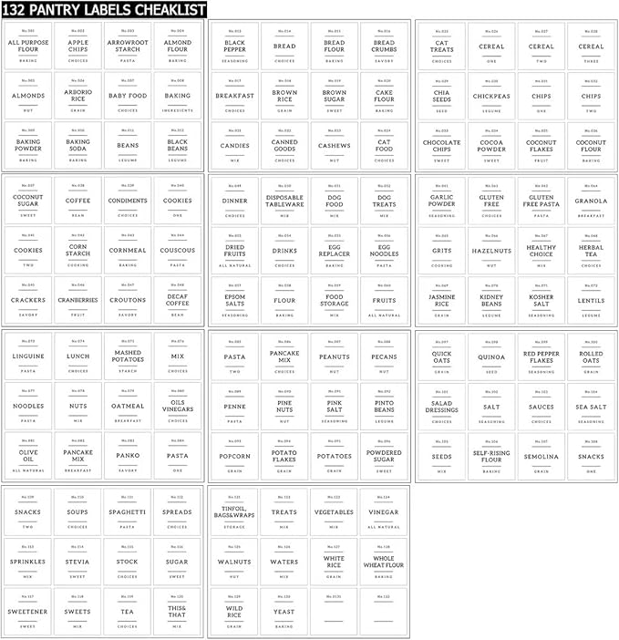 - 【PERFECT FOR PANTRY】132 Kitchen pantry labels for containers to keep your food fresh and pantry tidy. Minimalist labels are black text on white food labels stickers suitable for all airtight storage containers. Pantry decal organization labels are preprinted on premium waterproof vinyl stickers that won't tear or peel off but can easily be removed.