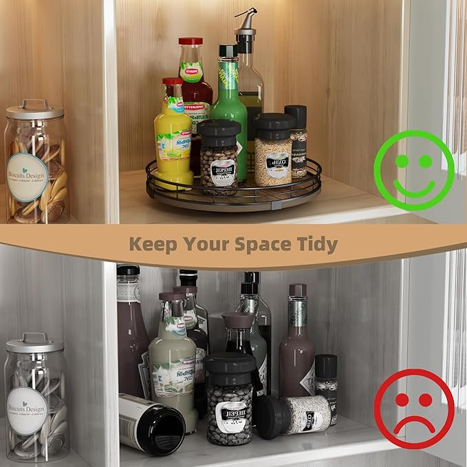 - 360°Smooth Rotation - The lazy susan turntable rotates smoothly and silently, placed next to the stove for easy access to condiments, spices, olive oil and cooking supplies. Placed next to the sink to display soap lotion. Thoughtful kitchen countertop organizers to rid your life of clutter!