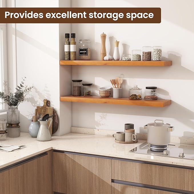 - Stylish Storage and Decor -These shelves are the perfect solution for greatful space in our pantry. it can hold pictures, candles and other small trinkets,Add these wall floating shelves to your kitchen, bedroom, bathroom, office, or living room for achieving a stylish décor upgrade that combines functionality and rustic charm.