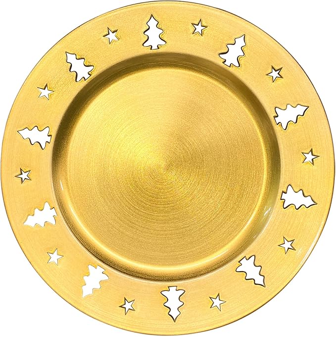 Gold Christmas Tree Charger Plates - 13" Reusable Openwork Holidays Party Decorations Round Chargers for Dinner Plate - Elegant Table Setting Centerpieces 6 Pack