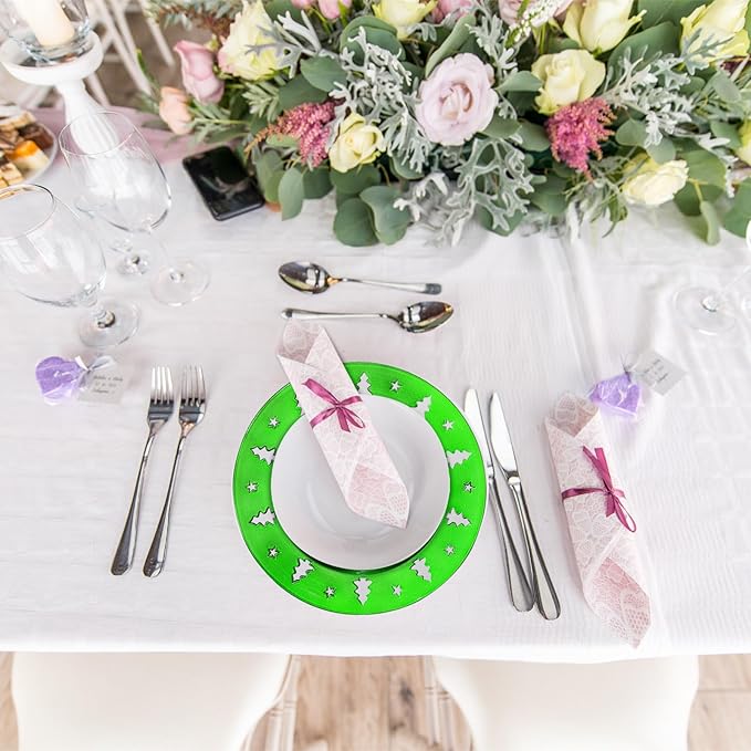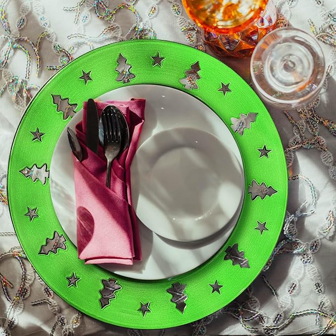 Green Christmas Tree Charger Plates - 13" Reusable Openwork Holidays Party Decorations Round Chargers for Dinner Plate - Elegant Table Setting Centerpieces 6 Pack
