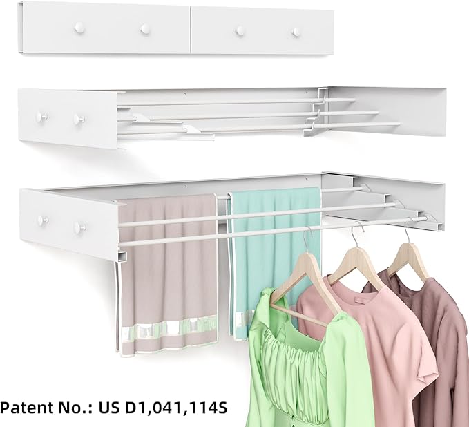 - Upgrade Drying Racks & Space Saver: 4 convenient Knob Hooks attached on wall mounted drying racks make it easy to retract, allowing you to hang clothes, towels, ties or extra stuff even when folded. Upgrade smoothness and quietness when retracting and opening. Upgrade the stability of poles, so the rods on it never spin with wet laundry loaded. laundry drying rack folds flat against the wall, really save space when not in use.