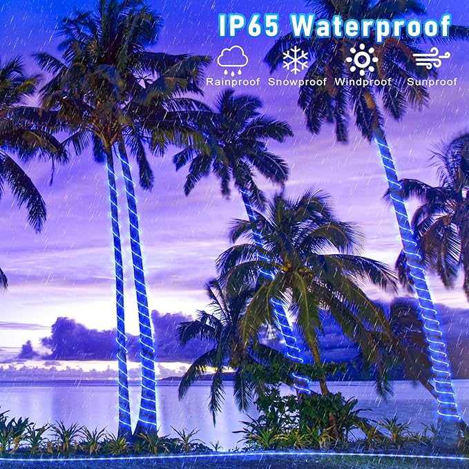 - 【Waterproof Outdoor String Lights】- IP65 Waterproof, they are suitable for all weather use, remaining bright and sparkling even during strong rain and windy days. The outdoor rope lights is ideal for year-round outdoor decor and can illuminate gazebos, canopy, corridors, gardens, and patios. But please note the plug is not waterproof.