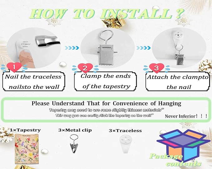 - SIZE AND HANGING: This boho tapestry size 59.1"x51.2", suitable for various walls and spaces. Contains 3 metal-free pushpins and 3 metal clips to help you easily install or remove.