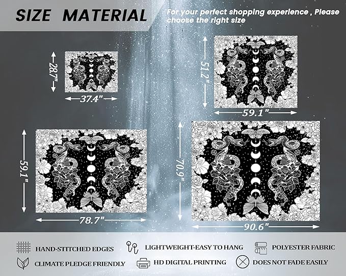 - Fabric: Moon phase tapestry is made of polyester fabric, which is soft, comfortable, durable, breathable and wrinkle-proof. It is not easy to fade and can maintain its original beauty for a long time.