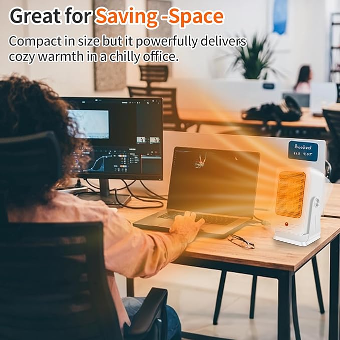 - COST-EFFECTIVE & ULTRA-COMPACT PERSONAL HEATER: Designed for focused warmth with minimal energy use, this small space heater for office efficiently heats personal spaces like desks, bedsides, or reading nooks without wasting power on unused areas. Its lightweight, slim build (easily fits in tight corners or luggage) —move from home offices to dorm rooms in seconds. This office heater is also ideal for camping area, tents or travel.