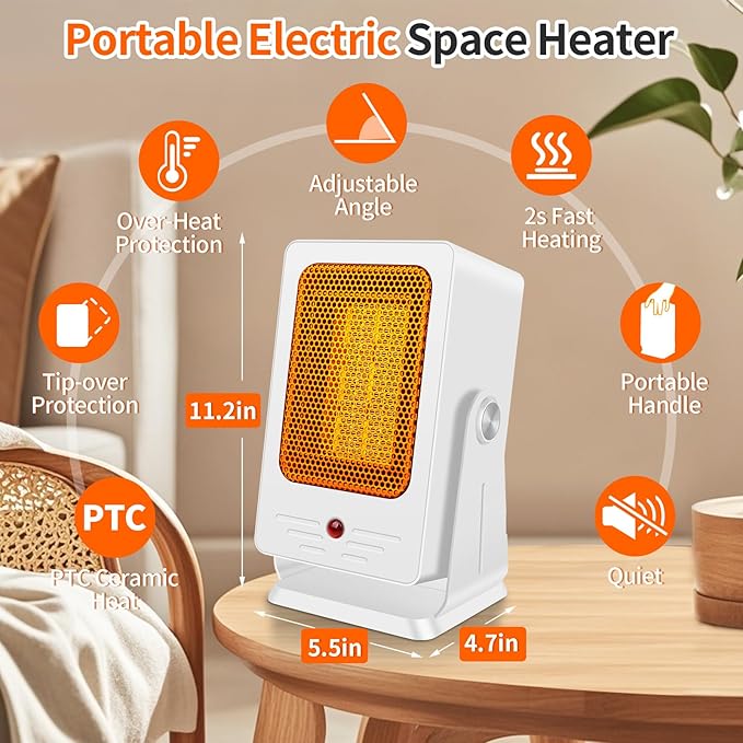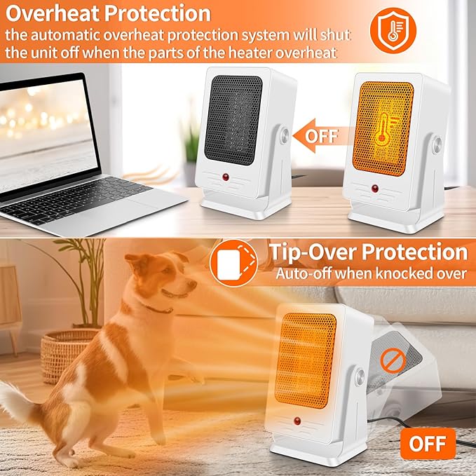 - SMART SAFETY, MULTI PROTECTION: Designed with home heating considerations, ensuring your peace of mind! Our portable heater features overheat protection and tip-over protection. Advanced overheat detection instantly pauses operation of electric heater if temperatures rise abnormally, while the gravity-sensitive base cuts power immediately if tipped—perfect for homes with active kids or pets. Designed for bedside tables, home offices, and areas where pets relax.