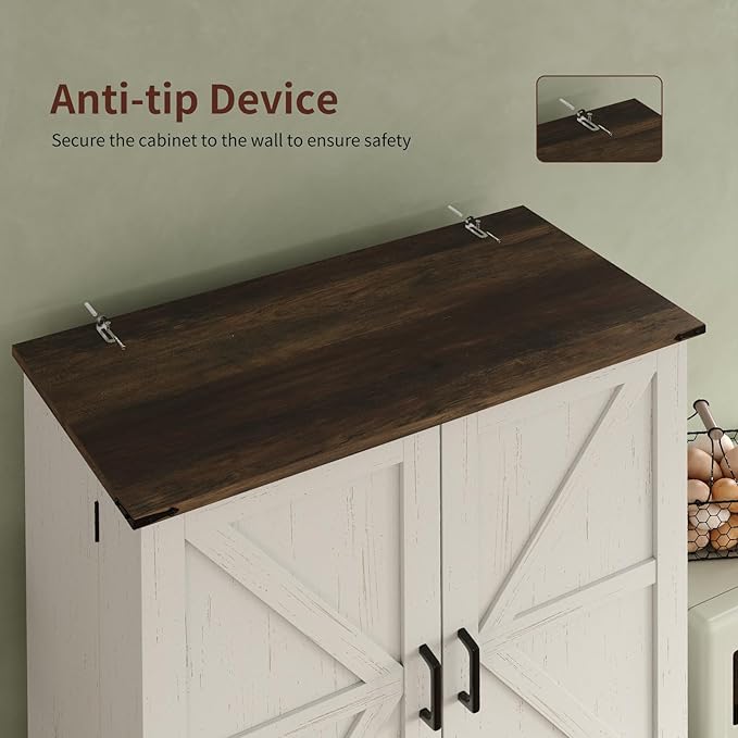 - Stable Pantry: Extracted from P2 MDF, each door comes with 2 hinges to ensure smooth operation and overall stability; Magnetic door locks make opening and closing the door easier; We have prepared anti-tipping accessories for you to fix the kitchen storage cabinet on the wall to avoid the cabinet from shaking and tilting; The waterproof surface makes the pantry to withstand moisture and steam, it is also suitable for bathroom, laundry room