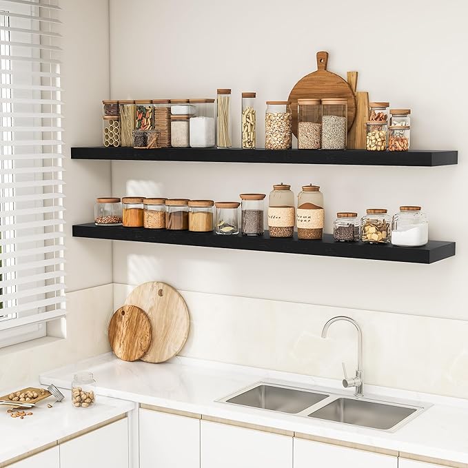 RICHFOCUS 72Inch Floating Shelves for Wall 2 Pack Shelves for Bedroom|Kitchen|Bathroom Wall Mounted Rustic Wood Floating Shelf with Invisible Brackets for Books|Storage|Decor, Black