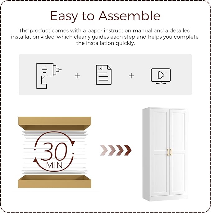 - 【Secure and Stable Design】 For added safety, the white pantry cabinets with doors and shelves includes an anti-tipping device and a wall anchor kit to prevent accidents. This secure design ensures stability, whether used in busy home environments or offices.