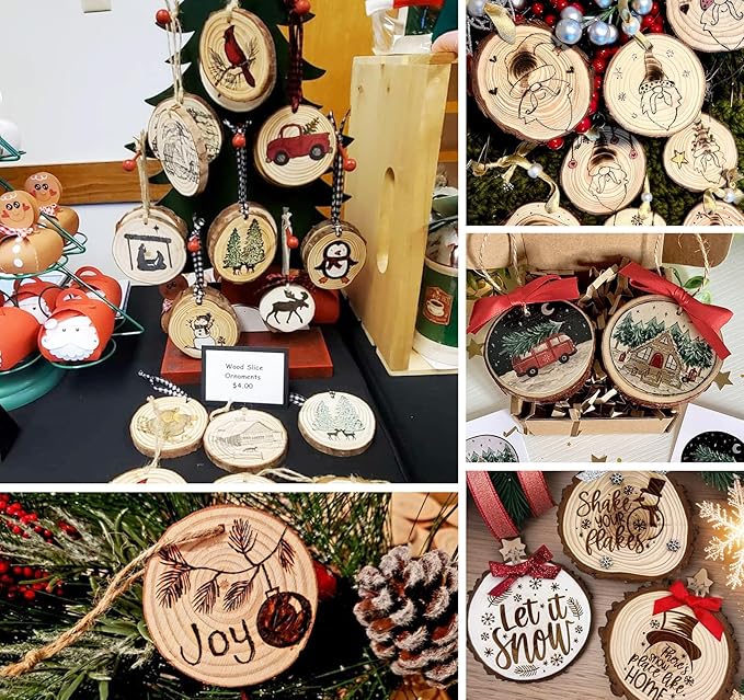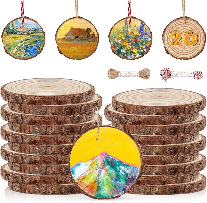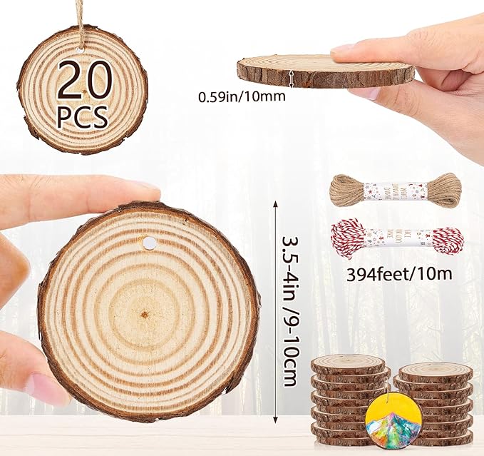 - [Smooth Surface]Lightly sanded to a smooth finish while retaining raw wood texture – ideal for painting, staining, carving, or calligraphy without compromising natural character.Minor bark shedding may occur during crafting.Comes with 2x10m twine bundles (Yellow & Red-White) + pre-drilled holes on every slice for instant ornament/decoration mounting.