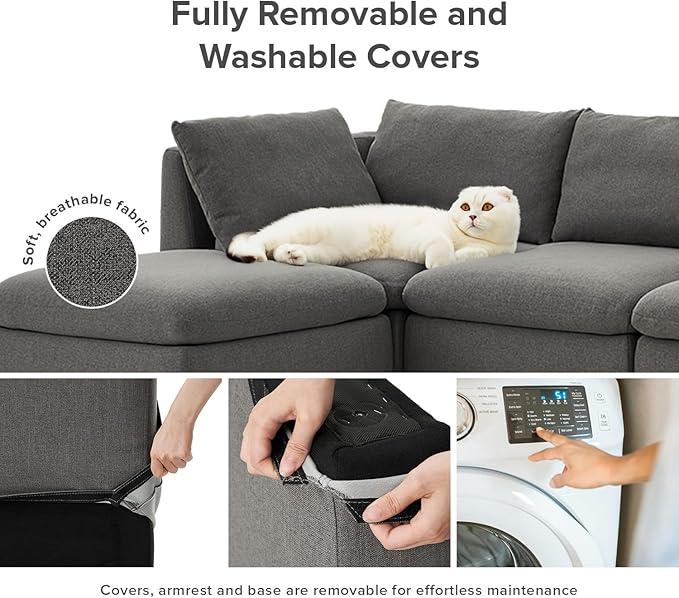 - Fully Removable & Washable Covers for Easy Care: Designed to keep up with real life, all covers, including the armrests and base, are fully removable and machine washable. Whether you’ve got kids, pets, or just the occasional spill, this sofa is easy to keep fresh and clean