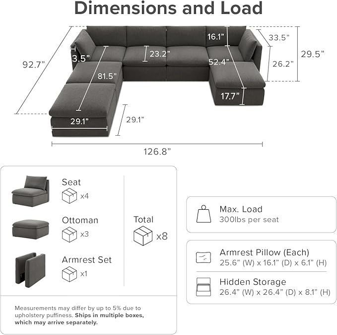 - Disclaimers: Colors may vary due to lighting and screen differences. Cushions are vacuum-packed and may take up to 7 days to fully expand. For best results, gently fluff and allow time to reach full volume. Measurements may differ by up to 5% due to upholstery puffiness. Ships in multiple boxes, which may arrive separately