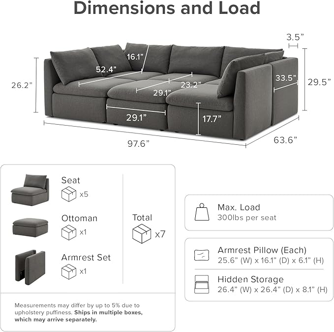 - Disclaimers: Colors may vary due to lighting and screen differences. Cushions are vacuum-packed and may take up to 7 days to fully expand. For best results, gently fluff and allow time to reach full volume. Measurements may differ by up to 5% due to upholstery puffiness. Ships in multiple boxes, which may arrive separately