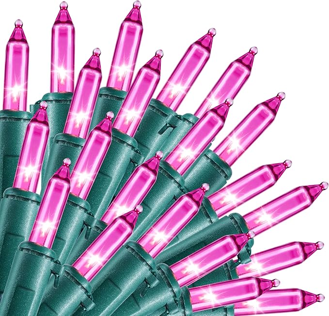 - Super Value Pack: Light up the upcoming Valentine's Day with pink lights through JOIEDOMI string lights.Our pink christmas lights have a total of 200 incandescent T5 bulbs with green wire. 40.8W 120V. Total Lighted Length is 39Feet. Total Wired Length is 43Feet. Bulb Spacing 2.36 inches.