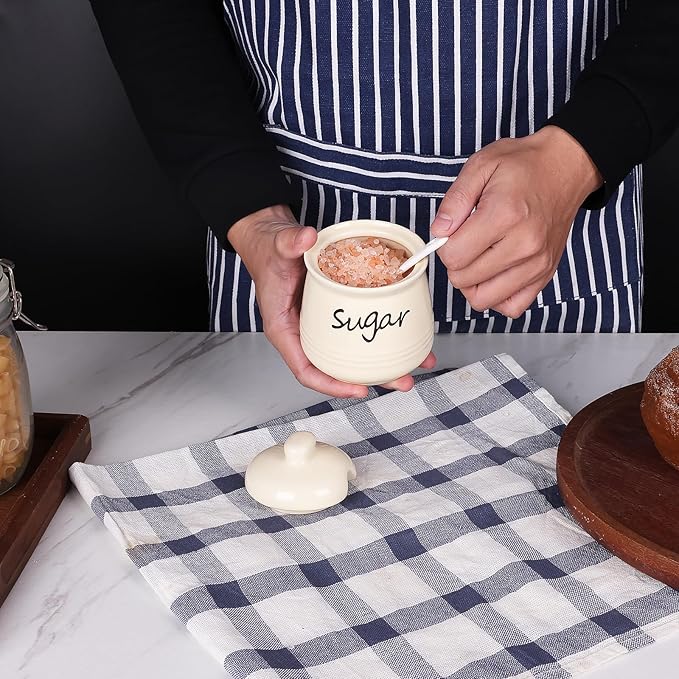 - DESIGN CONCEPT: This sugar bowl is equipped with a lid and a small spoon. The lid can keep your ingredients away from dust. There is a perfect notch on the lid for placing the spoon, so you don’t have to worry about placing the spoon randomly