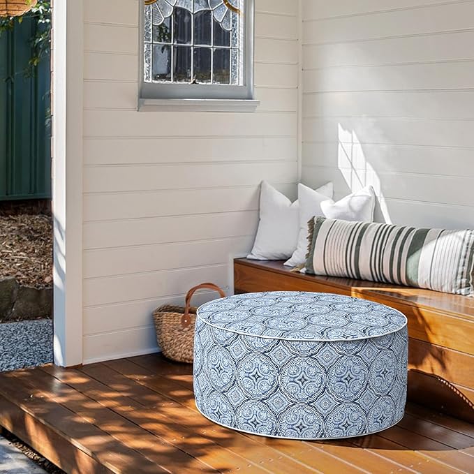 Inflatable Ottoman Stool D31 xH14 for Outdoor/Indoor Use, Water Repellent Patio Foot Rest Stool with Portable Handle,Round Pouf Ottoman Suitable for Garden,Deck and Camping - Medallion Blue