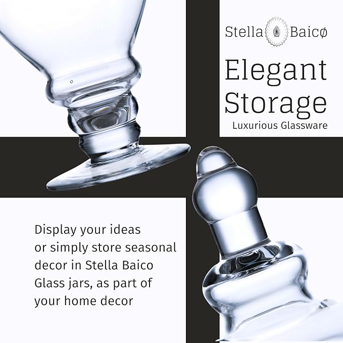 - HAND-BLOWN GLASS JAR: This Stella Baicø large apothecary jar with lid is expertly crafted from high-quality, hand-blown clear glass. Each glass canister is unique, and small air bubbles are a natural characteristic of the hand-blowing process.