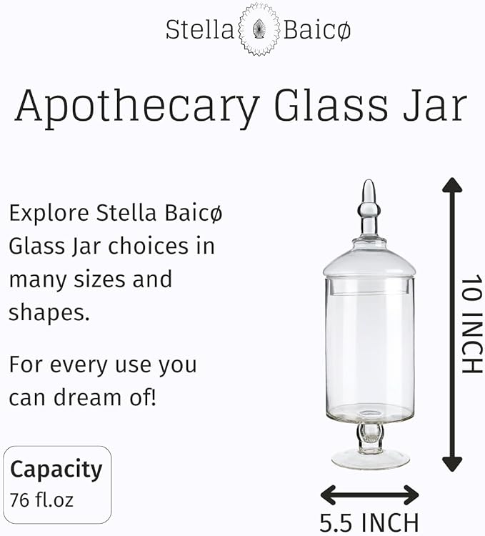 - HANDBLOWN GLASS JAR: Stella Baicø large apothecary jar with lid made from sturdy high quality hand-blown clear glass. Each clear glass jar is unique and handcrafted, meaning a few amount of air bubbles can occur.