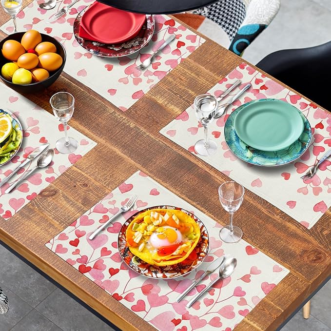 - LINEN FABRIC: Valentine Day pink love heart table placemats mainly made of cotton linen, which is soft, durable and wrinkle-proof, will protect your glass or wood table from scratches, spills, food and anything else of the like