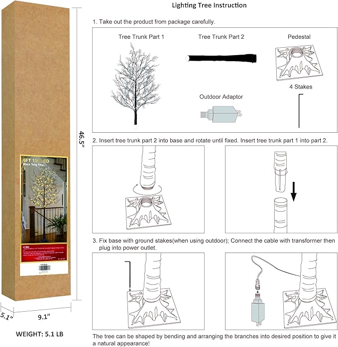 - 🎃Unique Design: 120LED Willow tree with warm white light, black trunk with perfect curve, coral-shaped branches add a mesmerizing atmosphere. Stable base stand with 4 ground stakes attached.