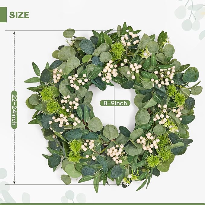 - 【Unique Design & High-Quality Materials】: This eucalyptus wreath features a blend of premium eucalyptus leaves and seeds in various shapes and shades of green, creating a lifelike and textured look. The silk leaves and foam berries ensure durability and a natural touch to your home decor.