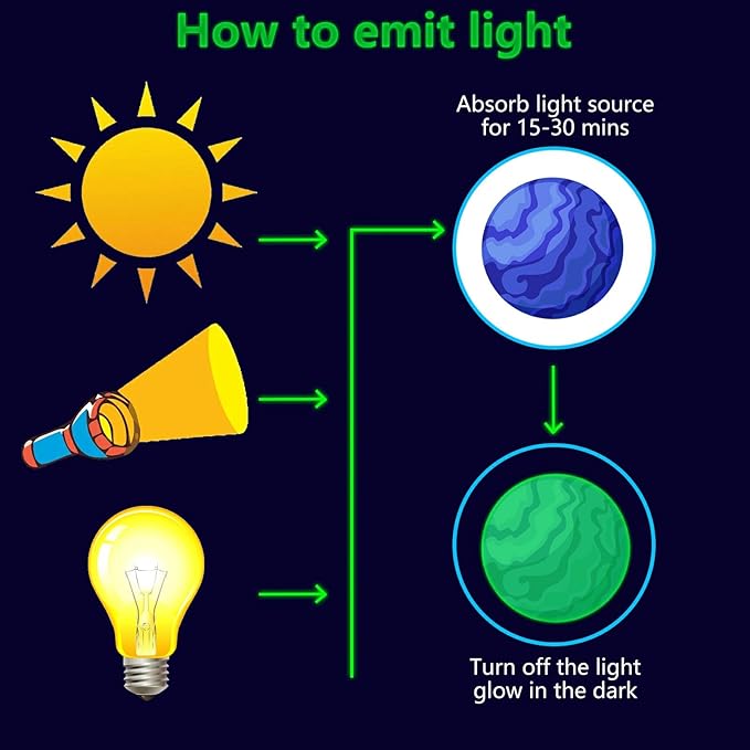 - ✦ Glow Stars Wall Decals: These glow wall decals for ceiling are made of quality luminous material,they will glow brightly when absorb enough light during the day. You just need to put it under lamplight flashlight ,room light or sunshine for 15 minutes, it will keep glowing for 8-10 hours with a gentle green fluorescent light. Please ensure the light shines on the decals without obstruction, the longer it takes to absorb light, then to light up for up to longer.