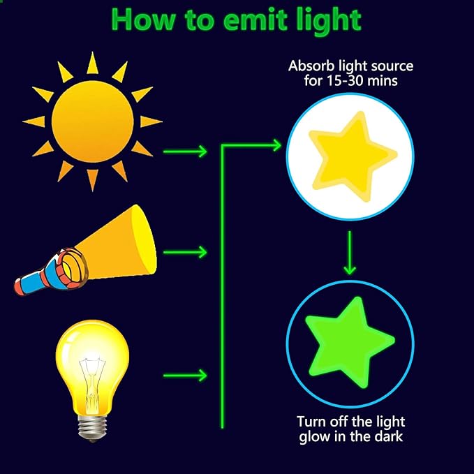 - ✦ Glow Stars Wall Decals: These glow wall decals for ceiling are made of quality luminous material,they will glow brightly when absorb enough light during the day. You just need to put it under lamplight flashlight ,room light or sunshine for 15 minutes, it will keep glowing for 8-10 hours with a gentle green fluorescent light. Please ensure the light shines on the decals without obstruction, the longer it takes to absorb light, then to light up for up to longer.