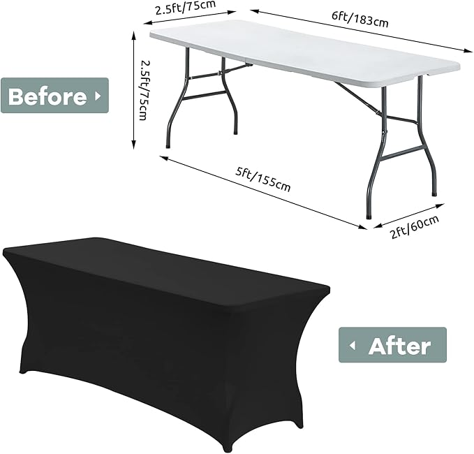 CWK 6FT 2Pcs Stretch Spandex Table Cover for Rectangular Tables - Elastic Fitted Tablecloth for Folding Tables, Wrinkle Resistant, Durable Table Protector for Parties,Weddings,Banquets &Events (Black)