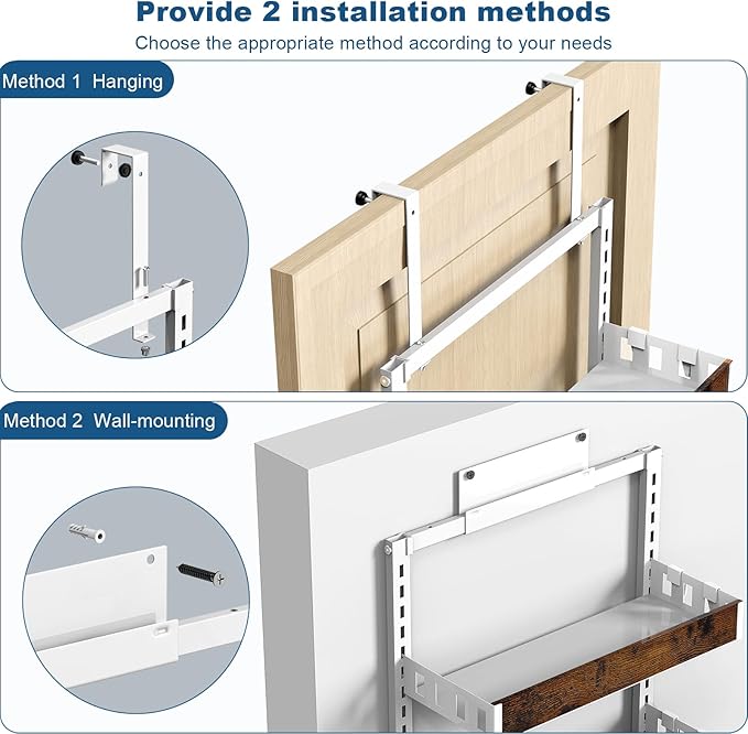 - 【Size and Load Bearing】The size of the whole shelf hanging door is: D6.3xW17.71xH56.50 inches;the size of the whole shelf on the wall is: D6.3xW17.71xH52.57. Please look at the other details in the picture. The bearing capacity of each layer of the hanging door is about 11.11 pounds and the whole shelf is about 66.66 pounds; each layer of on the wall is about 22.22 pounds and the whole shelf is about 133.3 pounds. With 12 hooks improves space utilization and facilitates necessities in kitchen, bathroom or closets